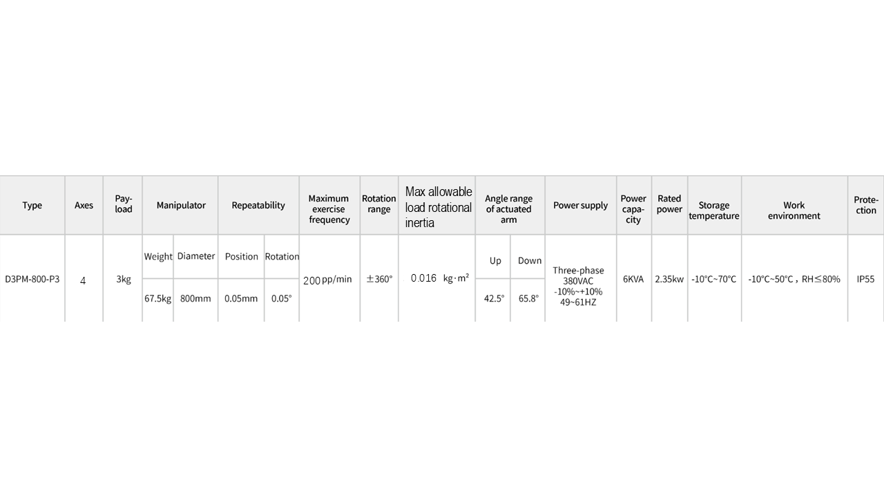 1. A standard cycle time of 0.3 seconds meets the demands for both maximum speed and cost-effectiveness. 2. The design incorporates a bottom-mounted rotary servo motor, shortening the power transmission path and effectively reducing accuracy loss in the rotational axis. 3. It is highly suitable for high-dynamic precision applications such as PCB board stacking, electronic assembly in the 3C industry, and hardware component slot insertion.