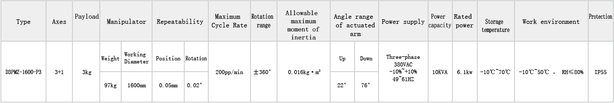 The classic high-speed parallel robot configuration has the functional characteristics of translation along the XYZ axes in three-dimensional space and rotation around the Z axis. By matching with a high-precision machine vision system, it is suitable for high-speed production operations in the food, medicine and other industries. It is mainly used for the assembly, handling and sorting of light and small scattered materials.