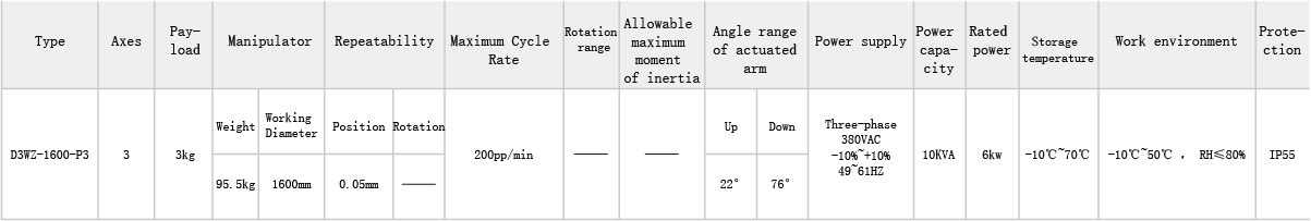 Classic high-speed delta robot configuration, featuring translational movement along the XYZ axes in three-dimensional space. It is ideal for high-speed production operations in industries such as food and pharmaceuticals, and is primarily used for rapid handling and sorting of regularly shaped products with consistent infeed.