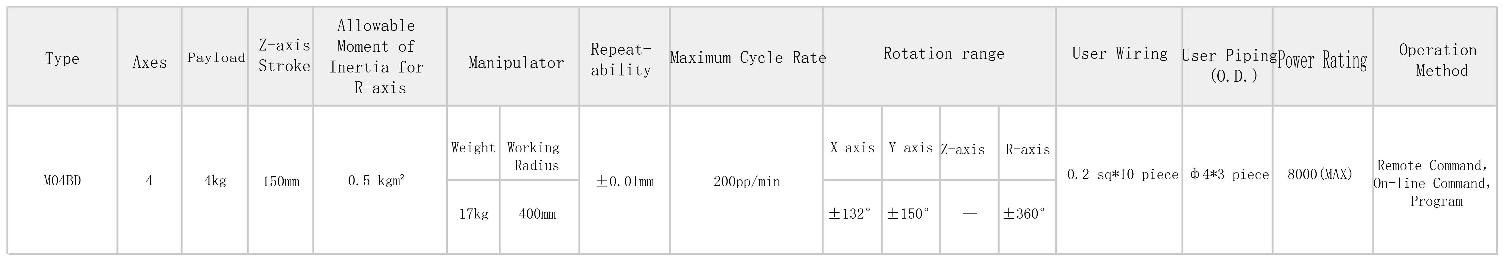 The robot has a reach of 400 mm. The upper arm can rotate up to ±132°, and the forearm can rotate up to ±150°. Its working envelope covers a wide fan-shaped area with a maximum diameter of 800 mm, meeting the requirements of long-distance handling, sorting, and assembly operations across multiple workstations.