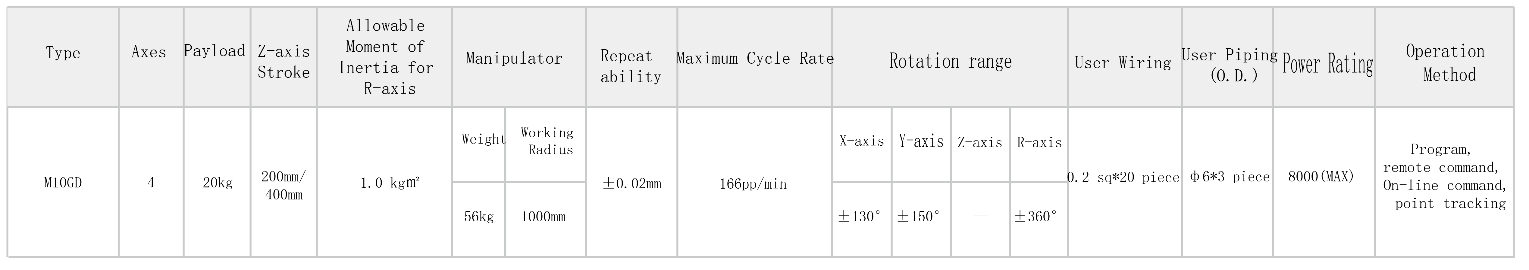 This series of industrial robots is a four-axis horizontal articulated robot. It features flexible motion, a compact structure, excellent dynamic performance, and high motion repeatability. The joints adopt a modular design and assembly, making installation and maintenance convenient, and can effectively replace light manual labor with payloads under 20 kg.